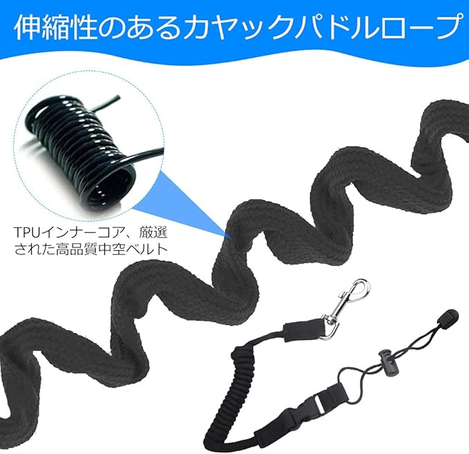 ↝【高品質なパドルリーシュ】:フックは亜鉛合金素材で作られ、優れた耐摩耗性があり、さびや腐食から保護することができます。そして、カヤックパドルリーシュはTPU材質で編まれているので、非常に丈夫です。安心して長時間使用することができます。
