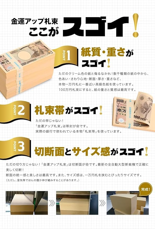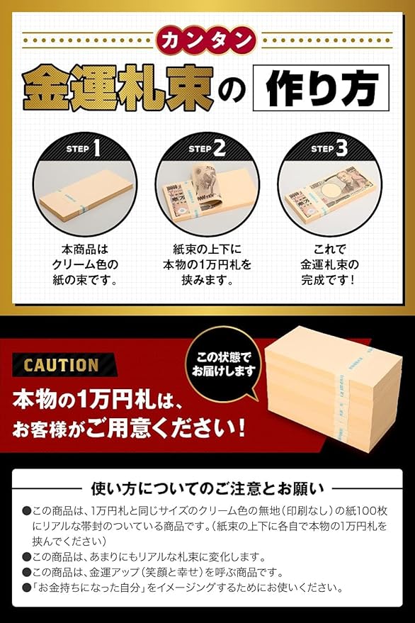 1万円札と同じサイズでクリーム色の無地の用紙です。 1束は100枚です。 帯は銀行で使用している本物です。 (金融機関の文字の位置は札束ごとにバラバラとなっております。) ※上記写真は、見本のため上に本物の1万円札を挟んでいます。 ご使用時には、ご自分で本物の1万円札を入れてください。 サイズ 一万円札と同じ(縦76mm 横160mm) ●重さ 約93g