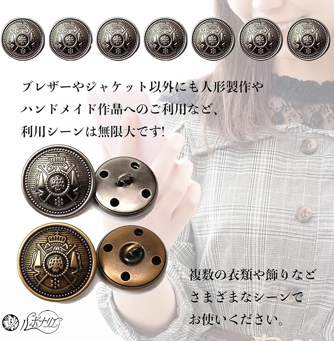 市販のブレザーやジャケットのボタンとは一味違うかっこよさです。さりげないおしゃれにセンスが光りますね。男女問わずお使いいただけるデザインですので、ご家庭のストック用としても大変便利です。