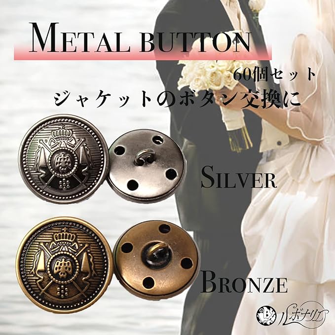 ジャケットのボタン交換に、とても便利なメタルボタン60個セットです。シルバーとブロンズをご用意致しましたので、お好みに合わせてお選びください。