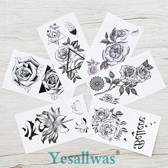 Yesallwas タトゥーシール 薔薇 黒 バラ 花 6枚セット 入れ墨シール リアル 防水 長持ち 刺青シール ボディーシール メンズ レディース black rose flower temporary tattoos 6x10.5CM (花)