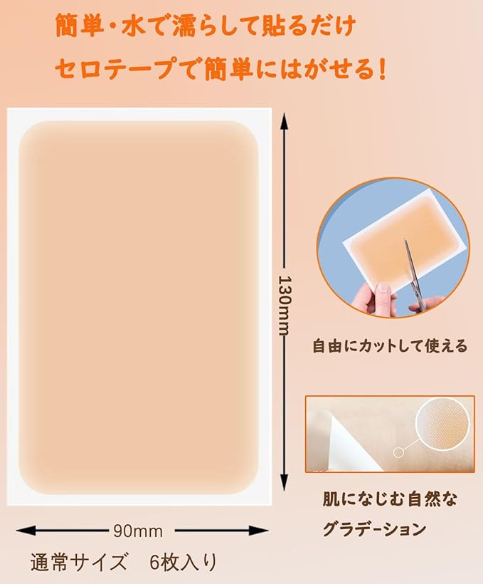 【極薄フィルム】簡単に貼れて好きなサイズにカットも。0.02mmの極薄フィルム/本物の肌に近い反射率/なめらかなグラデーション/5色のカラーバリエーションで、素肌のようになじむ自然なつけ心地。水に強く1週間継続使用が可能。各種試験をクリアした安心安全の品質。