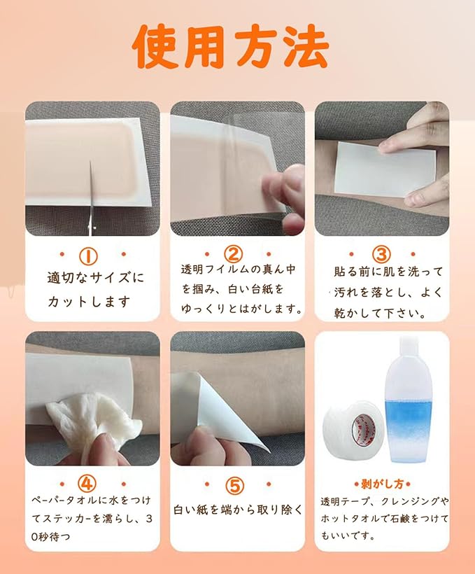 【貼り方】1.貼る前に貼りつけたい部分の肌をぬるま湯でよく洗い、汚れや油分を落とします。その後よく乾かし、水分を拭取ります。貼り付ける部分が汚れているとシールの粘着が弱くなり、剝がれやすくなります。2.適切なサイズにカットしてから、離型シート(台紙)から上の透明保護フィルムと一緒に絵柄をゆっくりとめくります。3.貼る位置を決めたら、粘着面を肌の上に乗せ、丁寧にしっかりと揉んだり、擦ったりして圧着させます。4.肌にシールが付いていることを確認し、透明フィルムを端っこからゆっくりと剥がします。