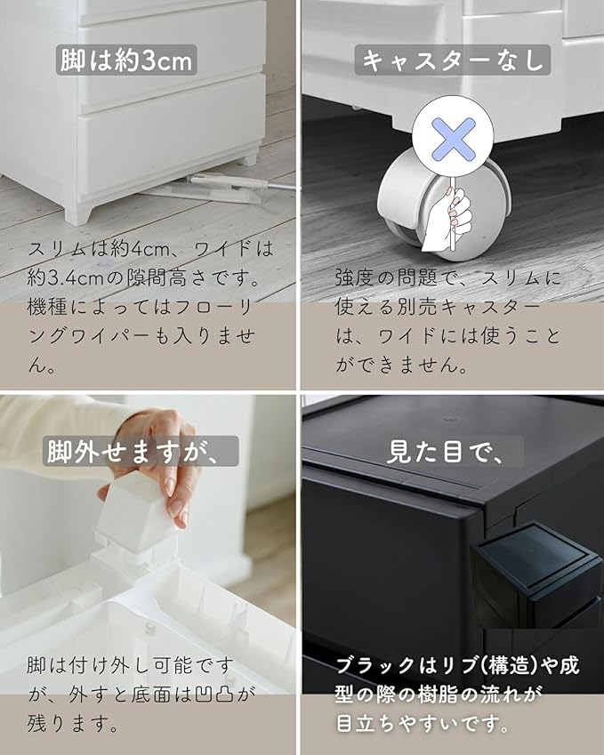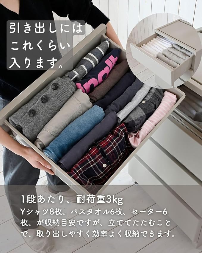 ●側面と背面も壁付きでホコリが入りにくいチェスト ●収納目安(引出し1段あたり): Yシャツなら約8枚、バスタオルなら約6枚、セーターなら約6枚 ●引出し内寸: 幅46 奥行36 深さ16cm ●耐荷重: 天板(約)3kg、引出し1段あたり(約)3kg●工具不要、かんたんに組み立て可能 ●側面と背面をパネルで覆い、ホコリ溜まりを軽減 ●中が透けないのでお部屋がすっきり ●お部屋になじむ、ツヤのないマットな質感 ●引き出しはストッパー付きで抜け落ち防止 ●本体下隙間: 高さ約3.4cm ※脚部は付け外し可能ですが、外す際は養生が必要です。 ※本品にはキャスターは取り付けできません。