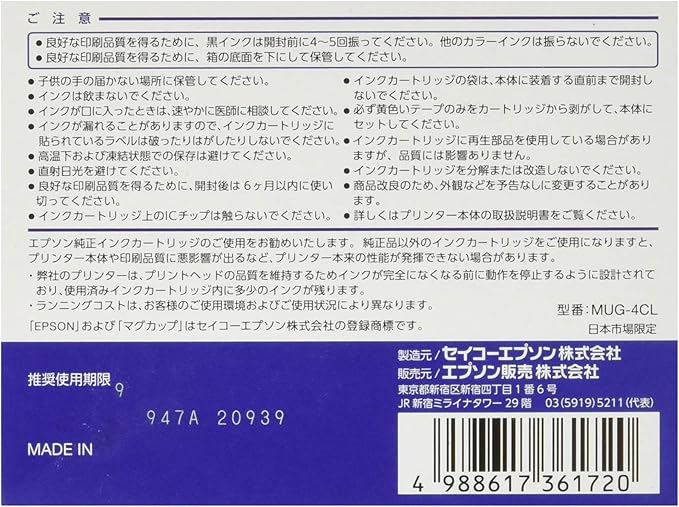 エプソン 純正 インクカートリッジ マグカップ MUG-4CL 4色パック