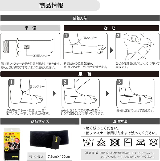 D&M ディーアンドエム スピードラップ 肘・足首サポーター 肘・足首兼用 スピードラップ 黒 フリーサイズ 日本製 D-75 固定 サポート 伸縮 長さ調整可 スポーツ ダンス