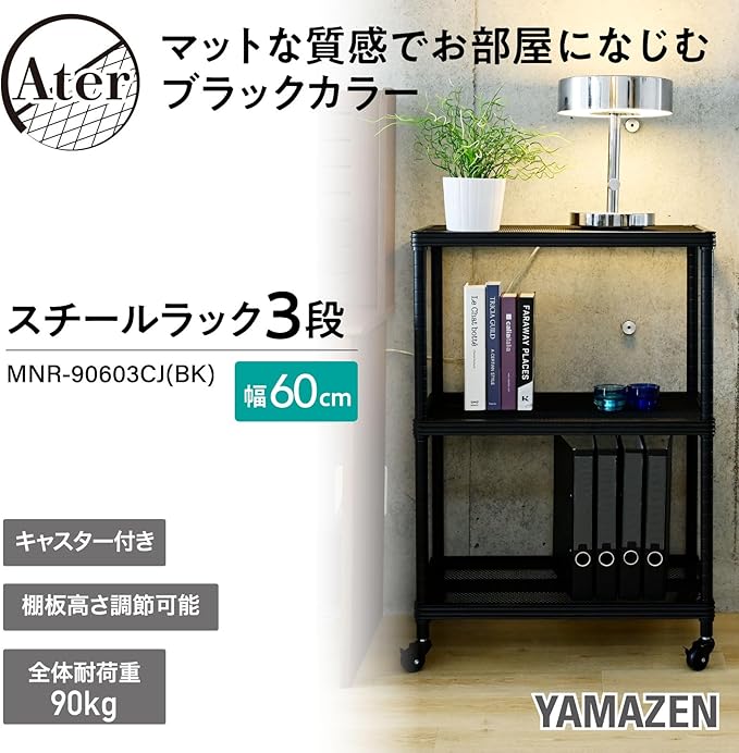 山善(YAMAZEN) ラック 棚 3段 キャスター付き 全体耐荷重90kg (高さ調節可能/荷重に強いキャスター) 幅60 奥行39 高さ90cm キッチンラック 収納ラック 組立品 ブラック MNR-90603CJ(BK)