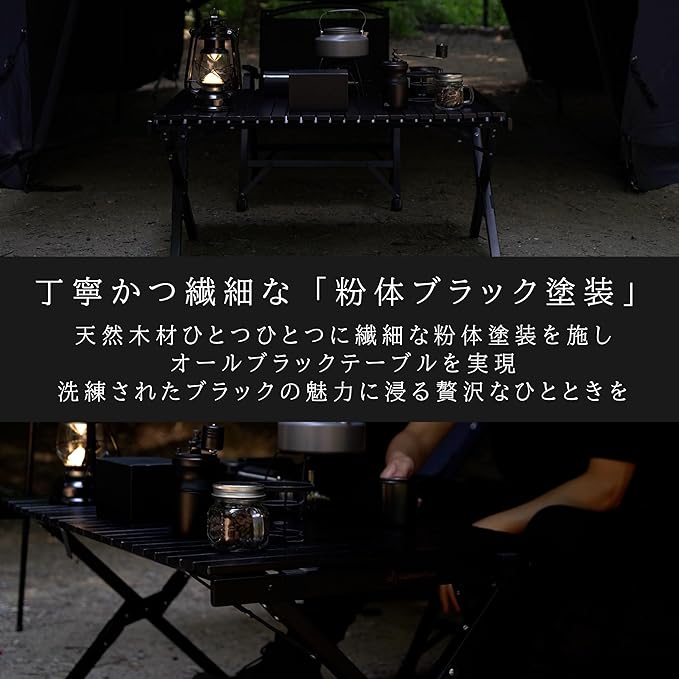 ✅【オールブラックのスタイリッシュなウッドテーブル】 木製フレームに丁寧な粉体ブラック塗装を施すことでスタイリッシュな印象を与えながら、天然木のぬくもりを感じさせます。折りたたみ式のためコンパクトに収納が可能。アウトドアはもちろん、室内での使用もオススメなテーブル。