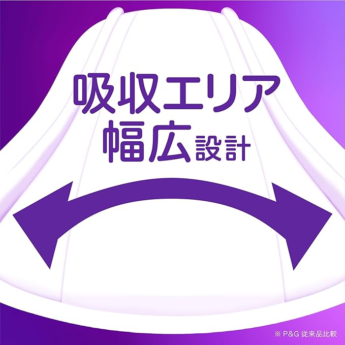 ギャザーが高くなった、ぴったりフィット横モレ防止デザインで、横モレを防止。吸収エリア幅広設計*当社従来品比較。
