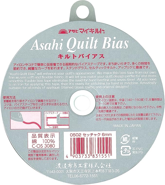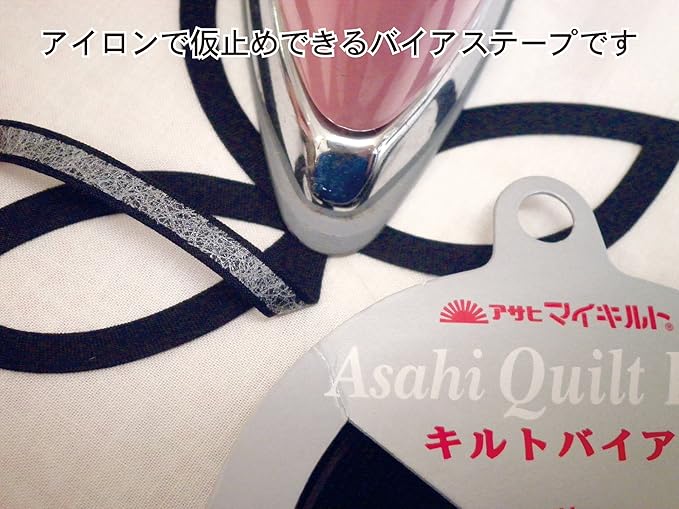アサヒキルトバイアスは、裏にアイロン熱で接着できる仮止めの糊が付いたバイアステープの元祖です。