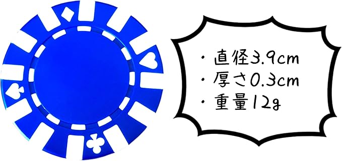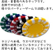 チップサイズは約:直径40mm 厚さ3.4mm、重さ12g (各色20枚 ブラック、レッド、イエロー、グリーン、ブルー)