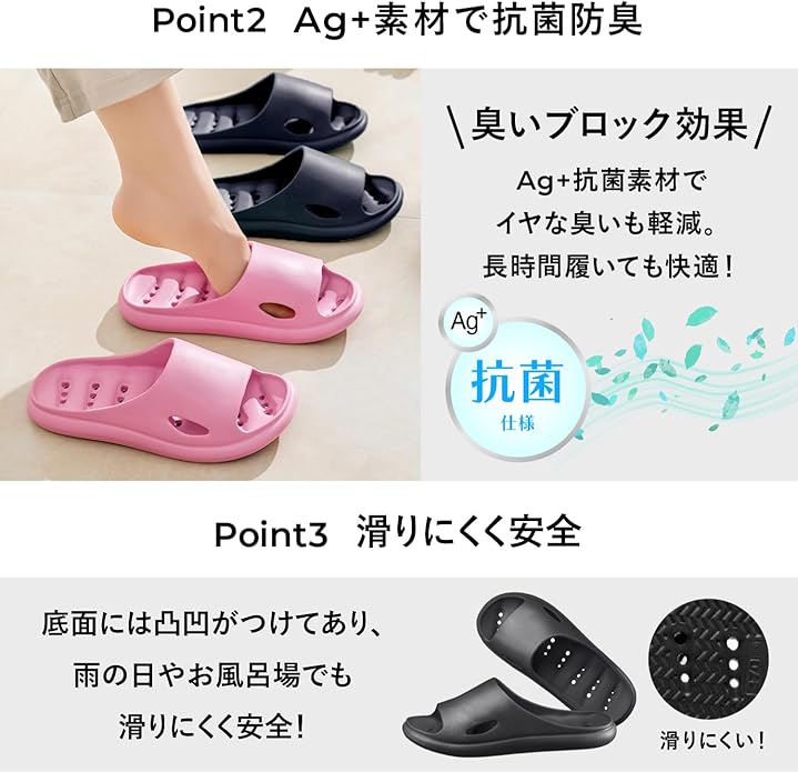 【抗菌防臭と滑りにくさで快適】Ag+加工で抗菌防臭。度洗っても抗菌作用は損なわれません!また、滑り止め設計もあり、歩行中の圧迫感や圧力を感じなく、リラックスした状態でご使用いただけます。外に出しっぱなしにしていても風で飛ばされる心配もなく、ベランダ用にもおすすめです。