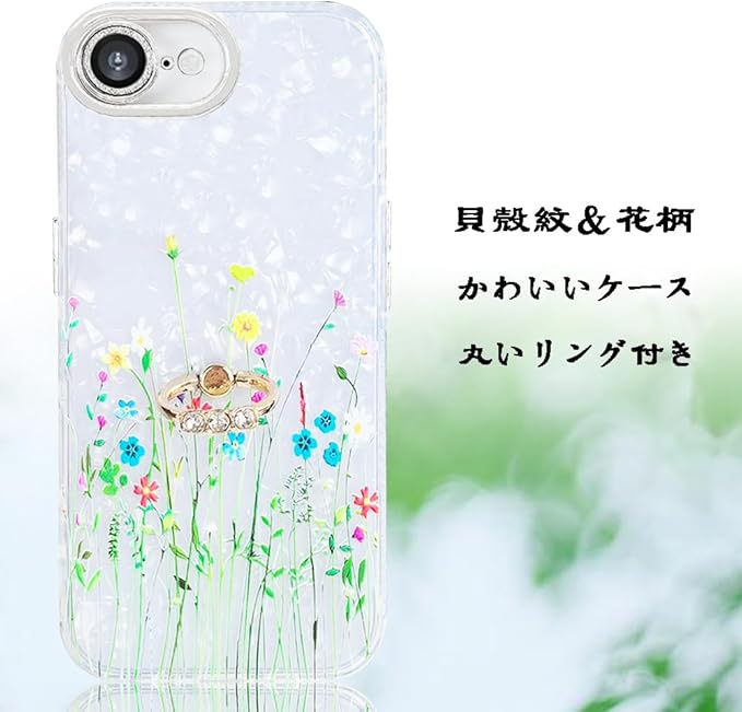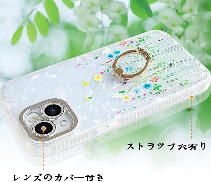 YUYIB iPhone 16e 用 ケース リング付き キラキラ レンズフィルム付き カメラ保護 かわいい 花柄 キャラクター ストラップホール おしゃれ 女性人気 耐衝撃 スマホケース アイフォン16e 携帯カバー (花柄1, iPhone 16e)