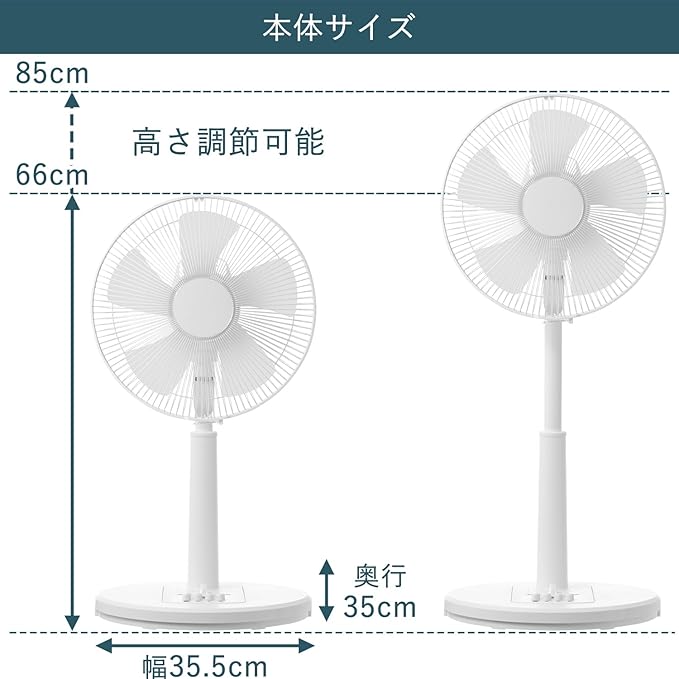 【商品仕様】▪本体サイズ:幅35.5 奥行35 高さ66~85cm ▪本体重量:2.8kg ▪電源:AC100V(50/60Hz) ▪消費電力:38/39W(50/60Hz) ▪電源コードの長さ:約1.6m ▪保証期間:お買い上げ日より1年間(保証の範囲については、取扱説明書をご確認ください。(一般家庭用以外(業務用など)に使用された場合の故障及び損傷などは保証対象外となります))