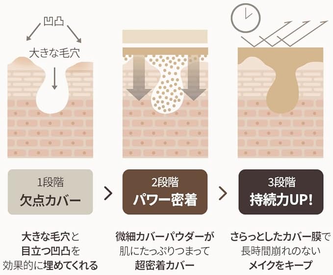 2重コア構造でコアエッセンス(ローション)+カバーリング(ファンデーション+日焼け止め)でマイルド成分UP、密着力UP