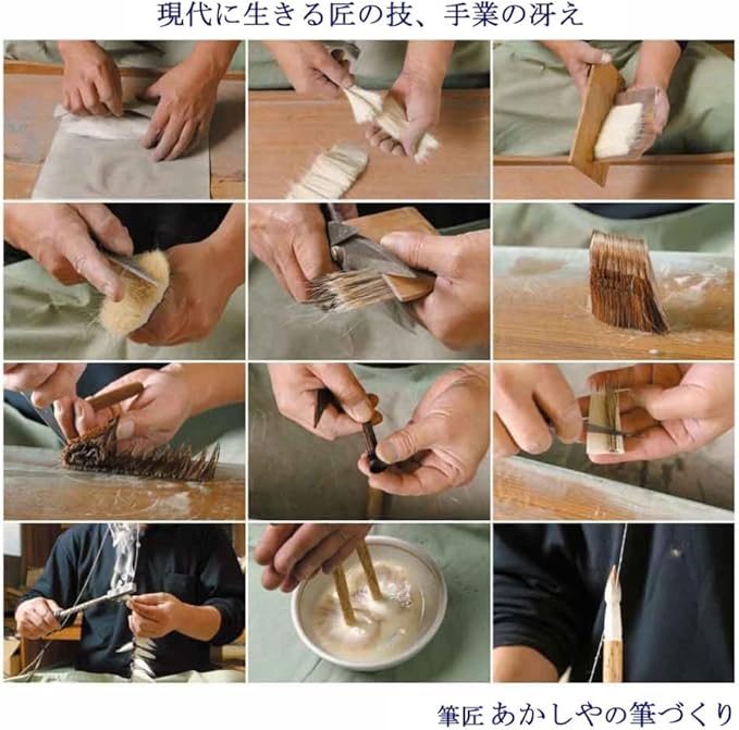 筆造りには柔剛程良く、墨含みの良い獣毛を10数種類より選び、その動物の種類や採取の時期、体毛の部位などによって筆質が変化。