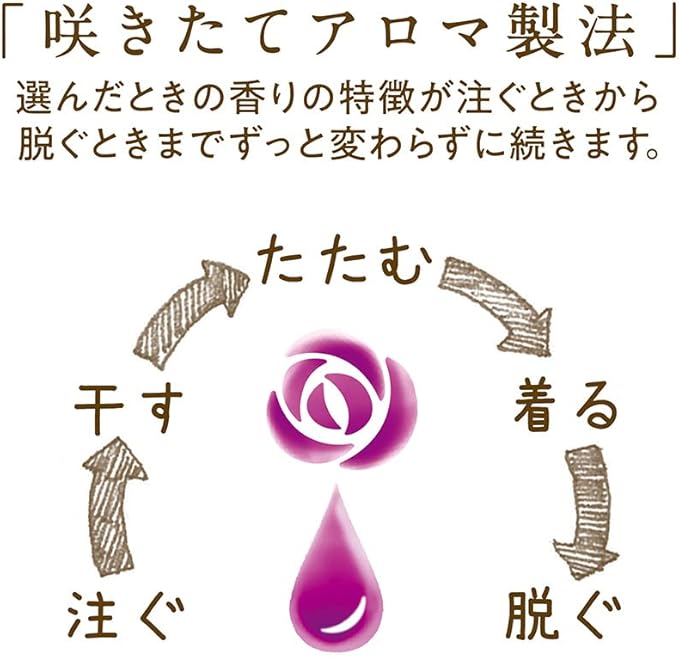(※1)ソフランアロマリッチ内(従来品含む)・選んだときの香りの特徴が、注ぐときから脱ぐときまで、ずっと変わらずに続く“咲きたてアロマ製法"。
