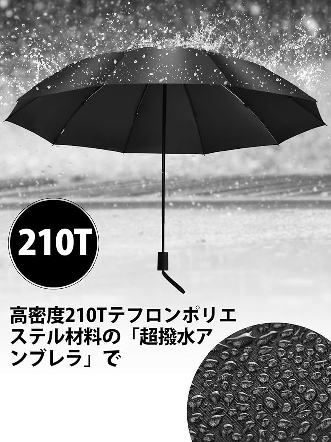 【超撥水性の逆折り式折畳み傘】:折りたたむ際に濡れた面が内側になる逆さ傘折り畳み方式を採用。高密度ポリエステル生地にフッ素加工を施し、雨滴が玉状にはじける特性を活かし、閉傘後3回軽く振るだけで水滴を除去可能。車内や人混みでも傘の外側が乾いた面になるため、周囲を濡らしにくい折りたたみ傘です。210T超撥水ナイロン生地:水玉が5秒で転落する速乾性能,傘を閉じたまま電車移動も水滴が気にならない