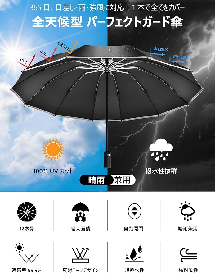 ️☀️【晴雨兼用折り畳み傘】裏面遮光性ブラックコーティングで強い日差し・紫外線を確実にカットし、暑い季節は日傘としても活用できる軽量設計で、ワンタッチ自動開閉機構により片手ボタン操作で瞬時に開閉可能で、手荷物を抱えた状態や車・バスの乗降時にもスムーズに使える大きめサイズで、折りたたみ式のコンパクトさと自動開閉機能を兼ね備えたカバン・車内常備に最適な、メンズを含む幅広い層に人気の多機能傘です。