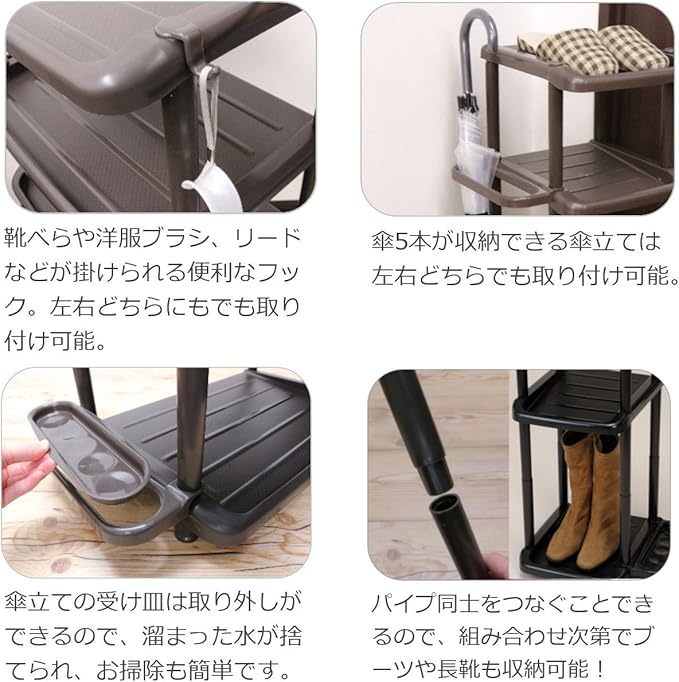 ・省スペースで靴、スリッパが収納出来ます。 ・傘が収納出来ます。 ・靴ベラ、ペットリードなどをかけておける 便利なフック付です。 ・支柱を繋ぐことでブーツなども収納可能です。