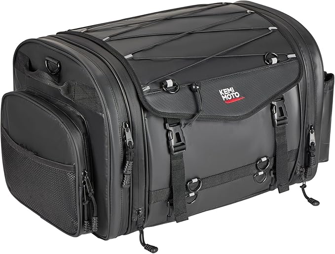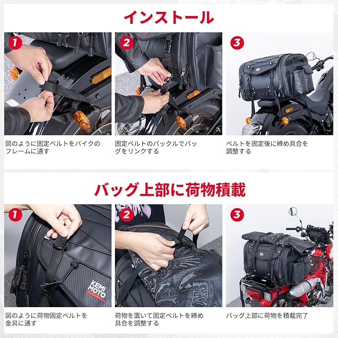 KEMIMOTO シートバッグ PVC防水素材 拡張機能あり 24-32L ツーリングバッグ レインカバー付き 全方位防水性 バイク リアバッグ 変形しにくい 荷物固定ベルト付き 上部積載可能 キャンピングシートバッグ バイク用品 汎用性 Ninja400/ZX-25R/V-STROM250/CBR400R/GSX-S1000/GIXXER250ほとんどのオートバイに適用