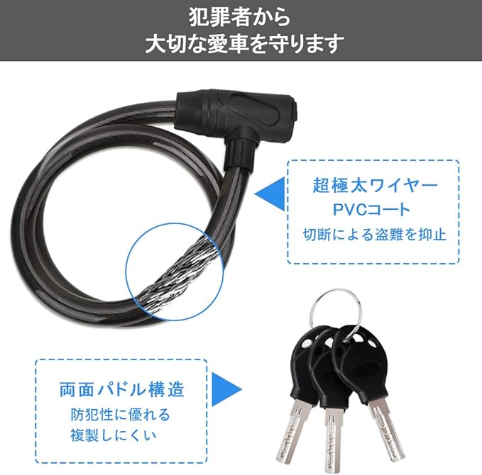 【防犯性抜群】 極太ワイヤーの上にPVCコートとナイロンカバーを加えていますので、低温の場合でも裂けなくて、高温の場合でも変わりません。ロック部分は錆びにくく加工を強化しました。高品質の素材を使い、切断による盗難を抑⽌して、愛⾞にも傷をつけませんので、お客様にもっと安心感を与えます。