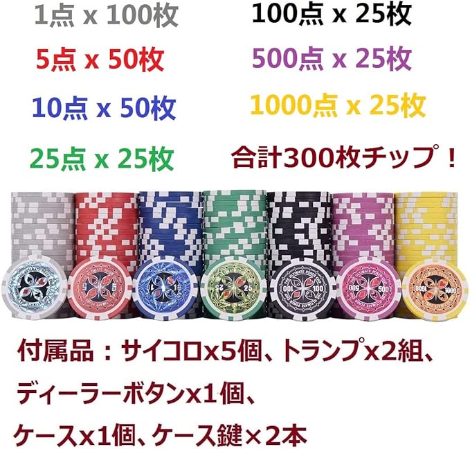 *チップ内容:1点x100枚;5点x50枚;10点x50枚;25点x25枚;100点x25枚;500点x25枚;1000点x25枚