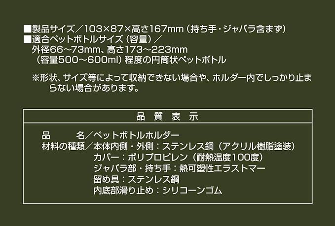 適合ペットボトルサイズ(容量):外径66~73mm、高さ173~223mm(容量500~600ml)程度の円筒状ペットボトル