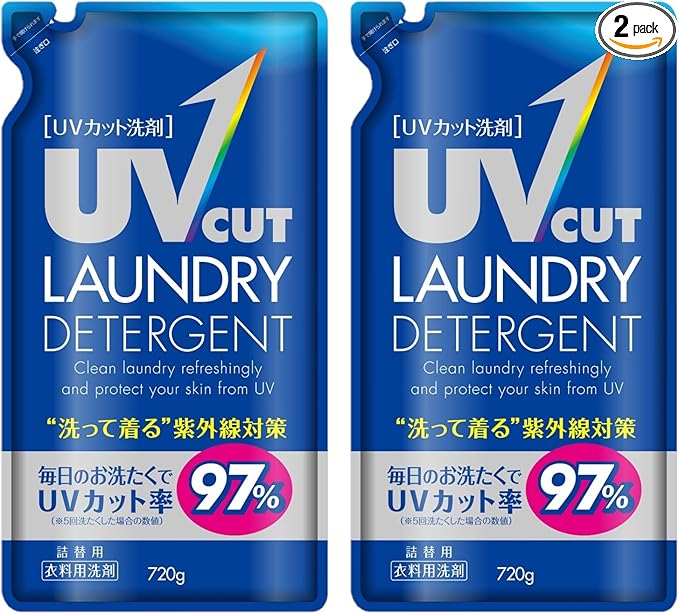 ●手軽に紫外線対策。しかも洗えば洗うほどUVカット効果は高まります。一回洗うだけで紫外線カット率92%。5回のお洗濯で紫外線カット率97%。もちろん洗剤としての汚れを落とす機能も抜群。洗濯物の汚れをすっきり落とした後は、紫外線吸収剤が紫外線をカットします。