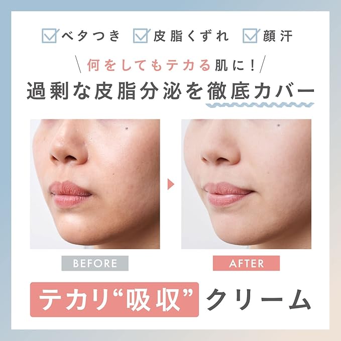 【テカリを吸着】肌に伸ばした瞬間、表面の皮脂やテカリをすっと吸い取る新感覚クリーム。必要な潤いだけを残し、崩れづらくメイクの映える肌へ導きます。