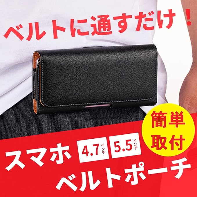 ポケットでかさばるスマホのストレスから解放してくれるスマホポーチ。 横向きに収納する仕様のベルトホルスター型スマホ収納ケースが登場! 使い方は超簡単!ベルトに通すだけ!ベルトループとボタン付きフックの二重仕様で落下を防止します。 4.7インチの参照サイズ:14.3cm(長さ) 7.5cm(幅) 2.2cm(厚さ) 主な対応機種:iPhone SE(第3世代) iPhone SE(第2世代) iPhone 8 iPhone 7 iPhone 6/6s等 5.5インチの参照サイズ:16.4cm(長さ) 8.8cm(幅) 2.2cm(厚さ) 主な対応機種:iPhone 13 mini iPhone 12 mini iPhone 8 Plus iPhone 7 Plus iPhone 6 Plus/6s Plus等 ※スマホケース装着時ケースの大きさによってはサイズが合わない場合がございます。