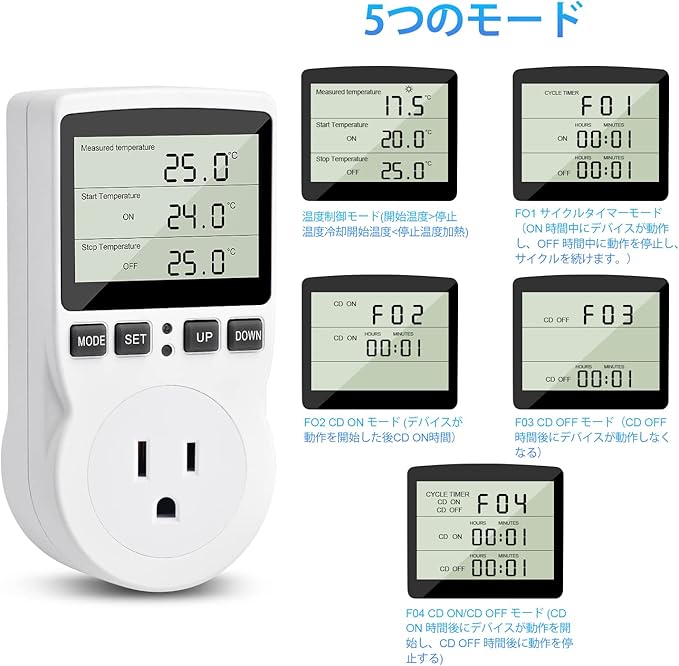 【温度調節ソケットボタン】 4つのボタン:MODEボタン、SETボタン、UPボタン、DOWNボタン、MODEボタン(MODE):MODEボタンを押す、LCD DISPLAY:温度調節モード - タイミングモードF01~F04