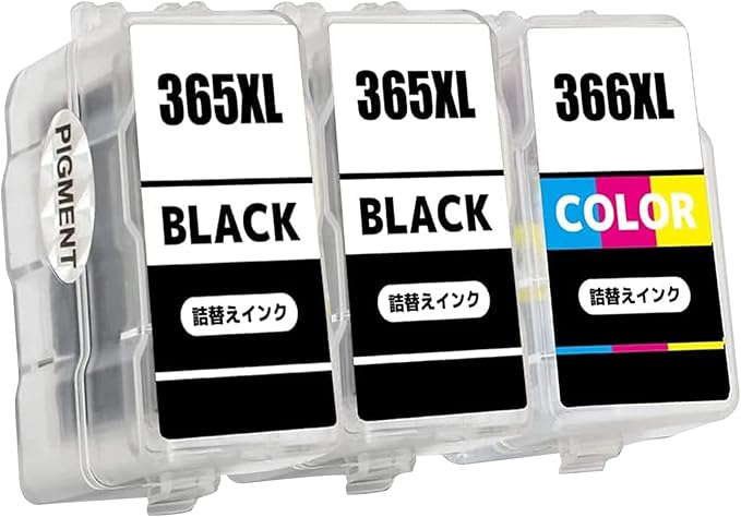 【セット内容】BC-365XL(BK/顔料ブラック)2本 + BC-366XL(CL/カラー) 合計3本セット最新互換詰め替えインク 手袋1組 取扱説明書付き ※取扱説明書には詰め替えに関する説明や動画のQRコードをスキャンして、取扱い作業のビデオが入手できます。【蓋の開け方についてご注意】細いマイナスのドライバー 1本で直ぐに開きました。多分横はなかなか開けにくいですが、お尻の方からだとすぐにパカッとふたが取れました。