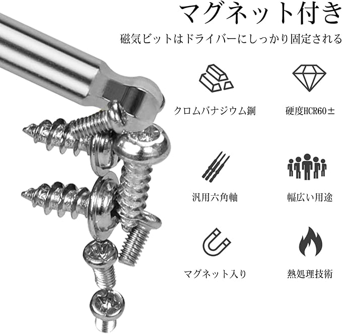 【カラーリング】カラーリングでサイズが分かりやすいです。ホルダー付き、ビット整理収納に便利です。ビットはマグネット入ります。斜めからでもねじが回せます。狭所や届きにくい箇所に便利なロングタイプです。