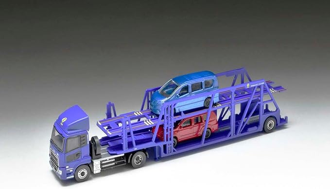 トレーラータイプのカーキャリアには、積載車を演出する小物として同じスケールの乗用車が2台付属。キャリアカーのトラクターキャブは UDトラックス クオン (現行モデル) で再現。単品のコレクションシリーズとしても、鉄道模型のストラクチャーとしてもお楽しみいただけるアイテムです。