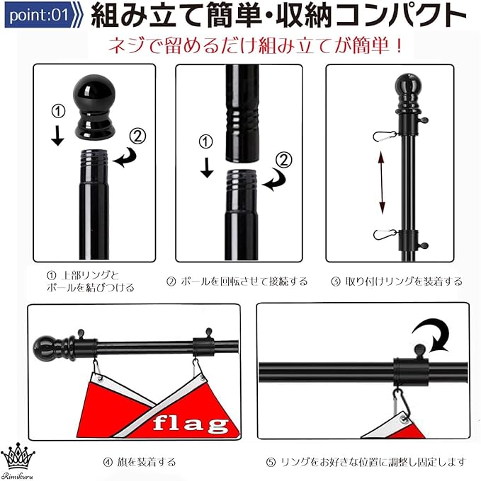 組み立て簡単・収納コンパクト:こちらの旗 ポールは5本のパーツに分かれており、それぞれのポールをネジで留めるだけなので組み立てが簡単な仕様になっております。旗ポールの長さは必要に応じて調整でき、最長は約189.5㎝となっております。使わないときはコンパクトに収納可能で、保管の際にも場所を取りません。
