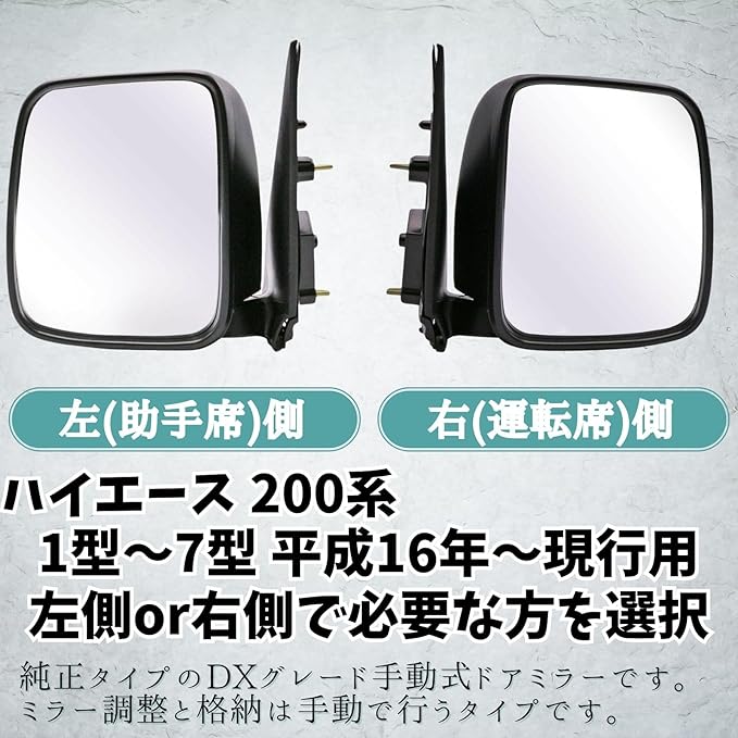 ✅【商品概要】この純正タイプDXグレード手動式ドアミラーは、ハイエースとレジアスエースにピッタリとフィットするよう設計されています。ミラー調整と格納は手動で行うタイプです。