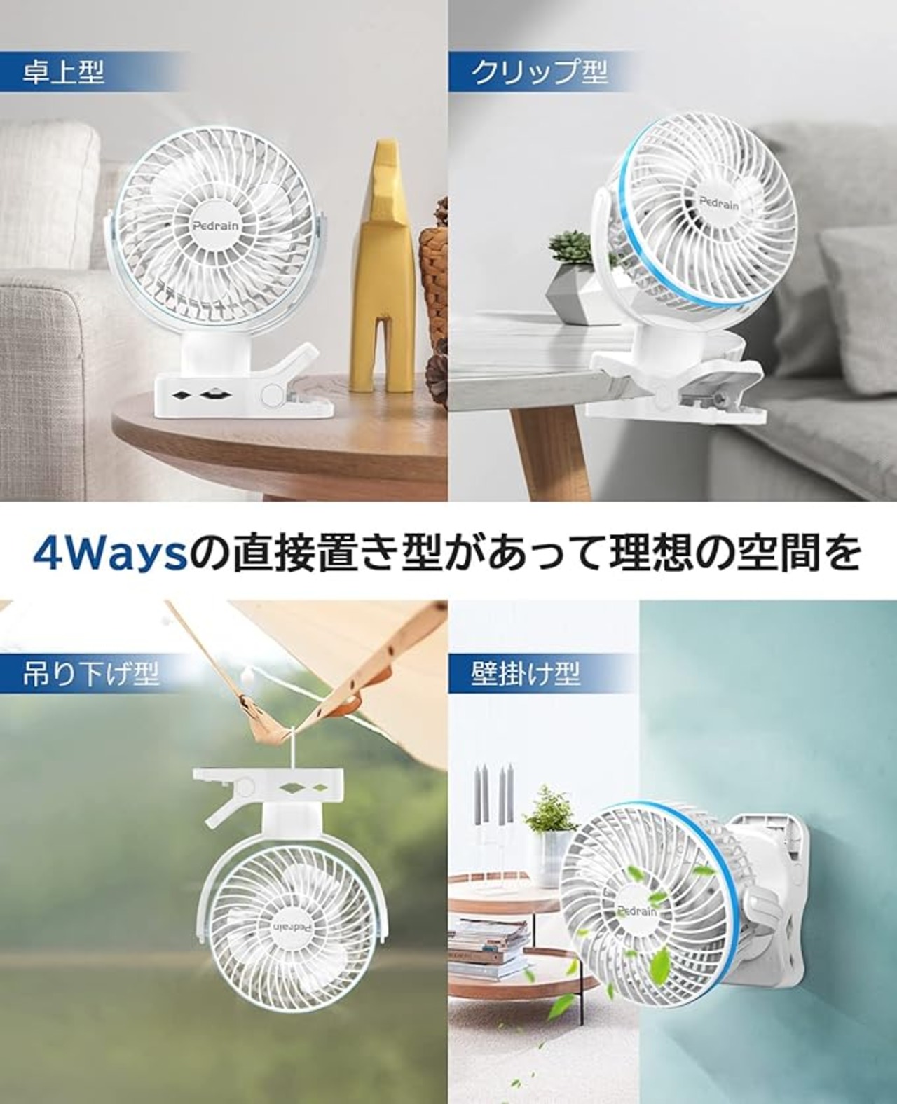 【卓上・クリップ・吊下げ・壁掛けの4Way】卓上、クリップ、吊下げと壁掛けの4つの使い方を備えたミニ扇風機は、便利なデザインでいつでもどこでも手軽に涼風を楽しむ。テーブルなどに気軽に置ける扇風機は、台座として使えるように滑り止めが付いており、食事中や仕事時などに重宝します。クリップ(最大幅は45mm)で様々な場所にしっかり挟んで使用できます。また、扇風機は壁掛け用フック穴が本体底面に設置してあり、壁に掛けて使用することも可能です。フックが付き、吊り下げ式ならテント内で効率的に涼んだり換気を実現します。オフィス、キッチン、車内、アウトドア、テントなどオススメ!