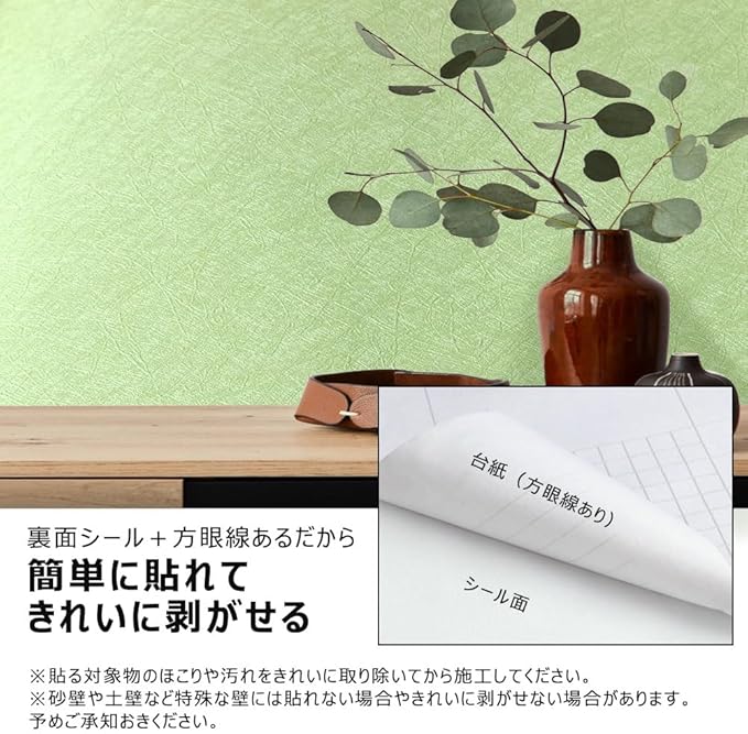 壁紙表面には繊維柄をエンボス加工して落ち着いた「和」の雰囲気でオシャレに模様チェンジできます!下地に透けない、シワになりにくく、貼りやすいです。また、防水性・防汚性にも優れ、お手入れは濡れタオルで拭き取るだけです。