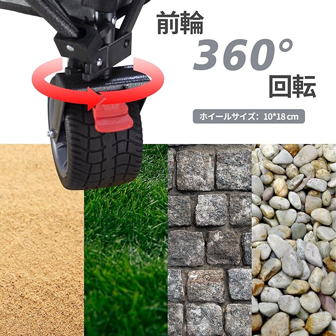 【ブレーキ付きワイドホイール】幅10 cmの大きなスポークを採用し、さまざまな地形に適応できる。砂地、泥地、芝生など、タイヤの積載能力が優れている。軸受を備え、車輪の滑らかな運転を保証する。しかもブレーキが付いており、いつでもブレーキをかけて安全を確保することができます。