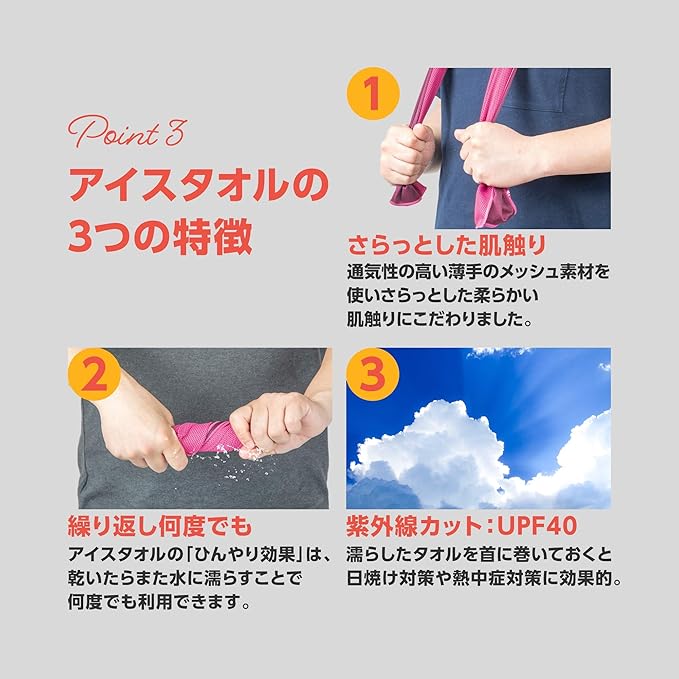 「濡らす・絞る・振る」たった3ステップで使える。紫外線カットUPF40。カラビナ付きで持ち運び便利。熱中症対策。【サイズ】120㎝ 30㎝。