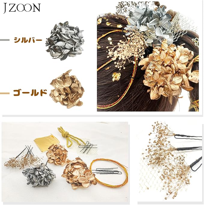 [JZOON] 髪飾り 水引 紐アレンジ ロープ ゴールド シルバー ドライフラワー プリザーブドフラワー ヘアアクセサリー 成人式前撮り 振袖 着物 和装 卒業式 結婚式 花嫁 ヘアアレンジ