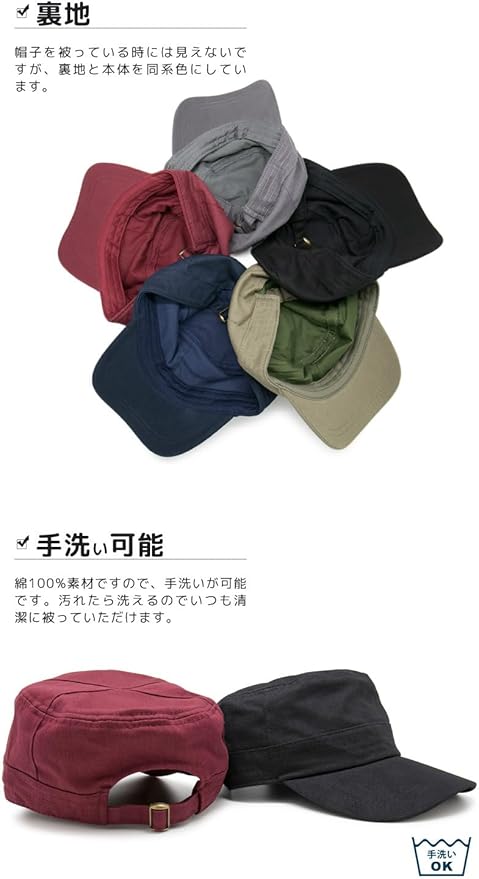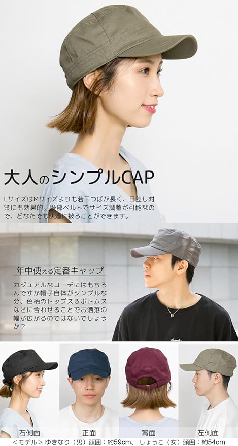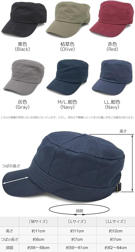 Mサイズ:サイズ表記56~58cm(頭囲:約56~58cm[後部ベルトでサイズ調整可能]、高さ:約11cm、つば:長さ約6cm・幅約18cm)、 Lサイズ:サイズ表記59~61cm(頭囲:約59~61cm[後部ベルトでサイズ調整可能]、高さ:約11cm、つば:長さ約7cm・幅約18cm)、 LLサイズ:サイズ表記62~64cm(頭囲:約62~64cm[後部ベルトでサイズ調整可能]、高さ:約12cm、つば:長さ約7cm・幅約18cm)