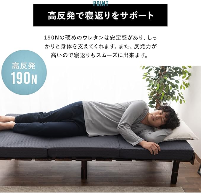 190Nの硬めウレタンは安定感があり、しっかりと身体を支えます。反発力が高いので寝返りもスムーズに。高反発ウレタンはクッション性にも優れ、身体の過度な沈み込みを防ぎます。