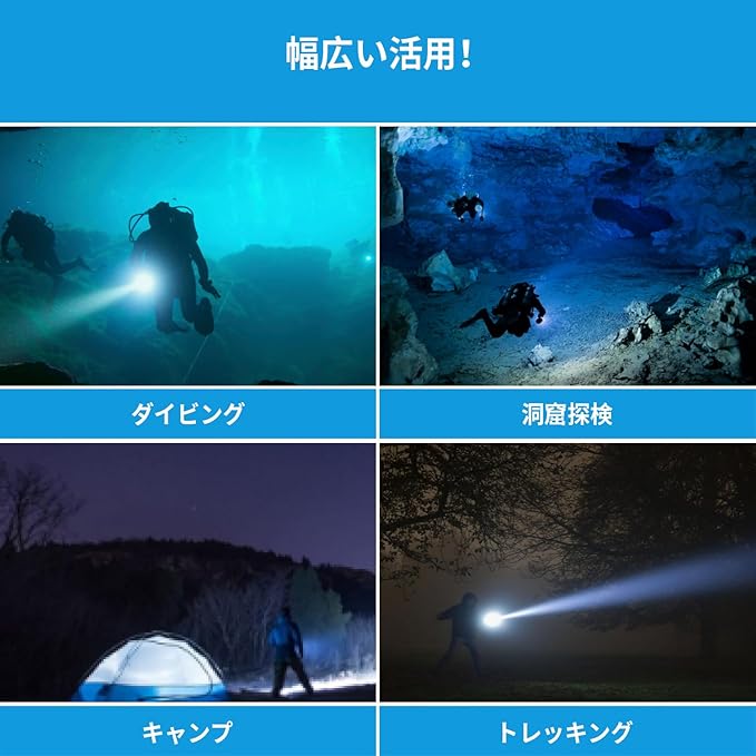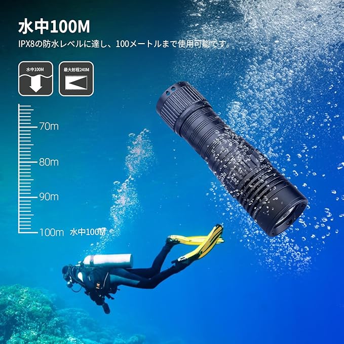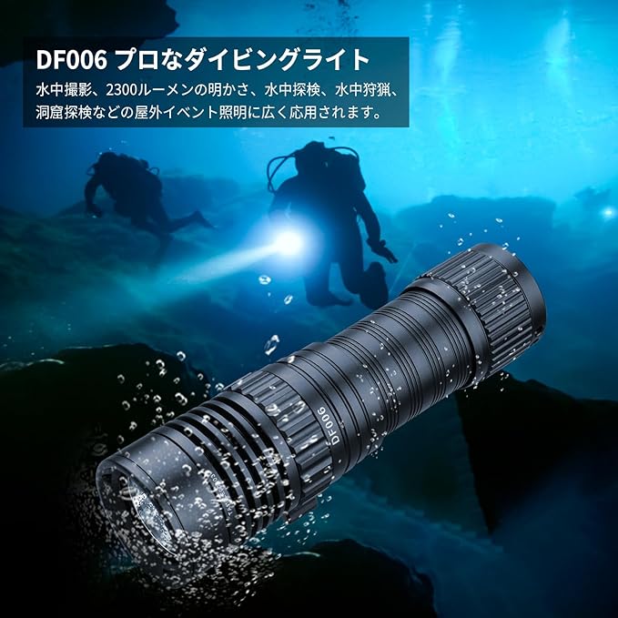 ✅超高輝度水中ライト:高品質LEDを搭載したDF006ダイビング懐中電灯、最大2300ルーメンの明るさと240mの光束距離に達し、水中の視野はもっとよくなります。ダイビング、洞窟探検、キャンプ、ハイキング、トレッキング、狩猟、釣りに最適です。