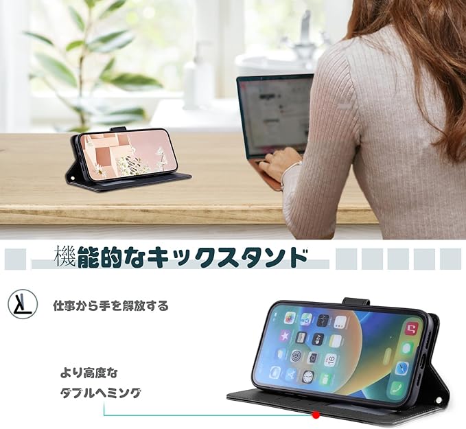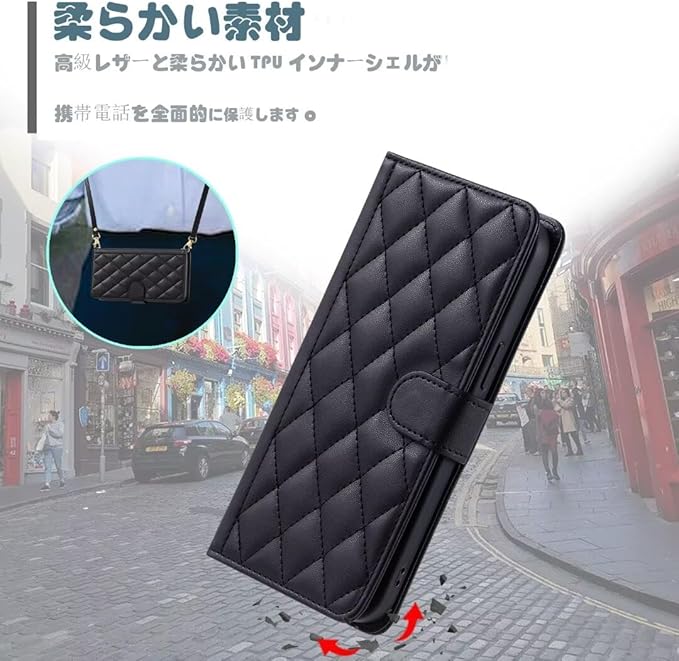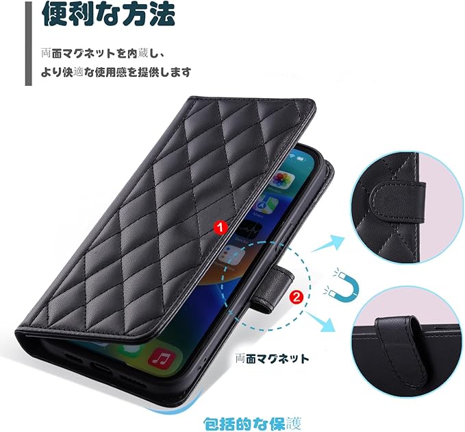 【高品質素材及び設計】大切なスマホを守る安心の手帳型。内部は衝撃吸収性に優れたTPU素材を採用して、落下時の衝撃を効率よく吸収するようにケースの各コーナー内側が設計されています。手触りが良く、キルティングの設計は控えめでエレガントです。