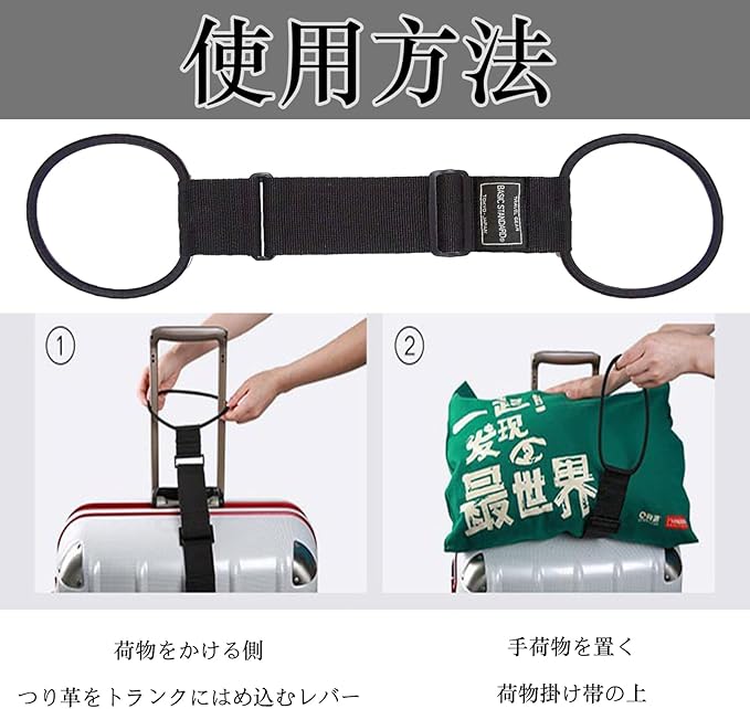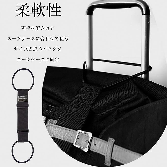 荷物固定ベルト 2個スーツケースベルト 固定ベルト 46*68 cm(調整可能)*幅5 cmキャリーケース ベルト スーツケース バンド 固定 ずり落ち防止 軽量 便利グッズ 多用途工具 旅行便利 出張 長さ(ブラック)【手に入れる】荷物固定ベルト数量2個、色,黒,軽量で、折り畳んで保管でき、持ち便利、スペースをとらない、女性にも手を痛めないワンタッチバックルで、簡単に使用が可能です。スーツケースベルト出張 国内旅行 海外旅行 電車 飛行機 移動時に キャスターバッグを持っていくときに役に立ちます。使わないときは畳んで旅行バッグの中にしまっておけるコンパクトさも人気の秘密です。【サイズマテリアル】 幅5 CM、長さ46*68 cm(調整可能)*幅5 cm(ブラック)。金具などがなく、バッグや荷物を傷つけることもありません。固定ベルトブロードバンドナイロン素材が作成されました、耐久性・耐摩耗性があります。キャリーケース ベルト金具をABS樹脂に変更し、軽量化とバッグなどを傷つけにくくなりました。【長さ調節可能!】荷物固定ベルトバッグ固定ベルトはアジャスタブルバックル付きで、ベルトの長さは46CMから68CMまで調節できます。ほとんどのサイズのサブバッグに対応できるよう長さを調節できます。スーツケース バンドバッグ固定ベルトの長さは任意で調節が可能なため、サブバッグの縦方向・横方向どちらにも対応できるワンタッチタイプのスーツケースベルトです。【使い方】 スライドハンドル付旅行用鞄に使用 スライドハンドルに片側のゴムをかけ、ベルトの上に載せる荷物をおき、固定ベルトもう一方のゴムをハンドルにかける ゴムを両方ハンドルにかけ、ベルト部にストールやミニバックをかけることも可 使用しないときはコンパクトに収納できるので、旅のお供におすすめ。【様々な場面で大活躍!】スーツケースの固定、屋内家具の固定、ルーフキャリアに荷物を固定、キャンプ用品を括り付ける、荷台の荷崩れ防止など様々な場面で大活躍します。荷物固定ベルト海外、旅行、出張などの場合に行く時もスーツケースベルトは役に立ちます。ビジネスシーンにも、ご家族での旅行でも、ぴったりです。ブラックの色で出張でもおしゃれなビジネススーツケースとともにご使用いただけます。出張が多いビジネスマンのマストアイテムです。