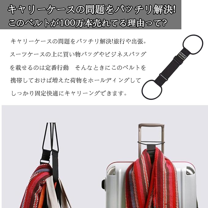 【使い方】 スライドハンドル付旅行用鞄に使用 スライドハンドルに片側のゴムをかけ、ベルトの上に載せる荷物をおき、固定ベルトもう一方のゴムをハンドルにかける ゴムを両方ハンドルにかけ、ベルト部にストールやミニバックをかけることも可 使用しないときはコンパクトに収納できるので、旅のお供におすすめ。