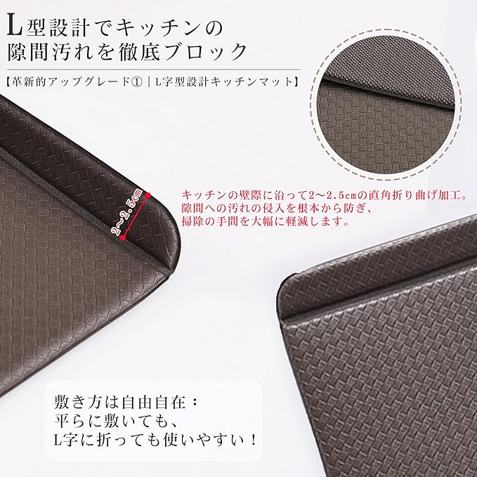 L型構造 – 最強の革新進化——業界初の革新的L型設計で、キッチンマットはついに新次元へ。通常の直線型マットでは対応できなかったキッチンのL字コーナーにぴったりと沿い、床を隅々まで保護。デザイン性と実用性を兼ね備えた、次世代型キッチンマットです。