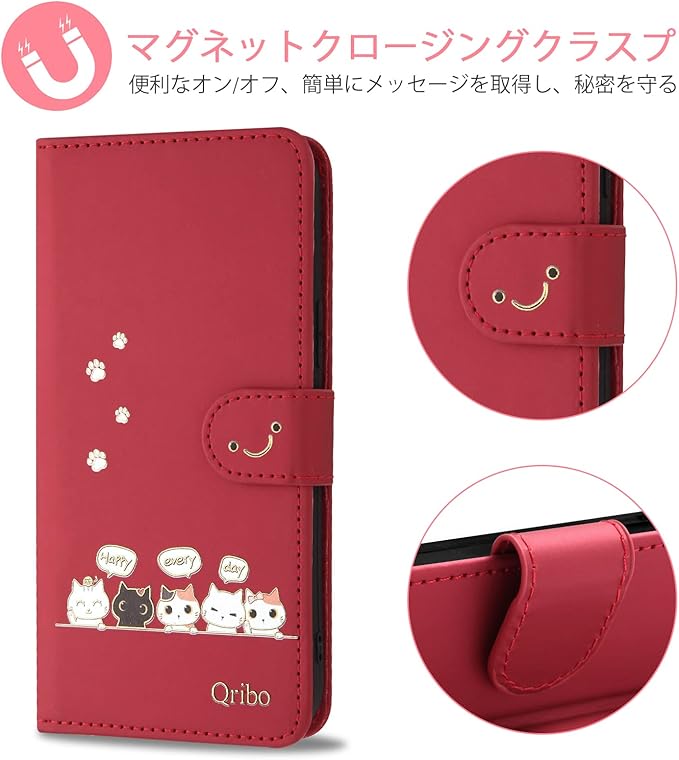 Qribo Xperia 5 IV ケース 手帳型 エクスペリア5 iv カバー SOG09 ケース XQ-CQ62 SO-54C ケース シンプルなのに可愛いデザイン エンボス加工猫柄 うれしい気持ち 6.1インチ対応 エクスペリア5 IV ケース SO-54C スマホケース Xperia5 IV ケース 薄型 防水 の耐久性 滑り防止 美しい 贈り物 友達 - 赤